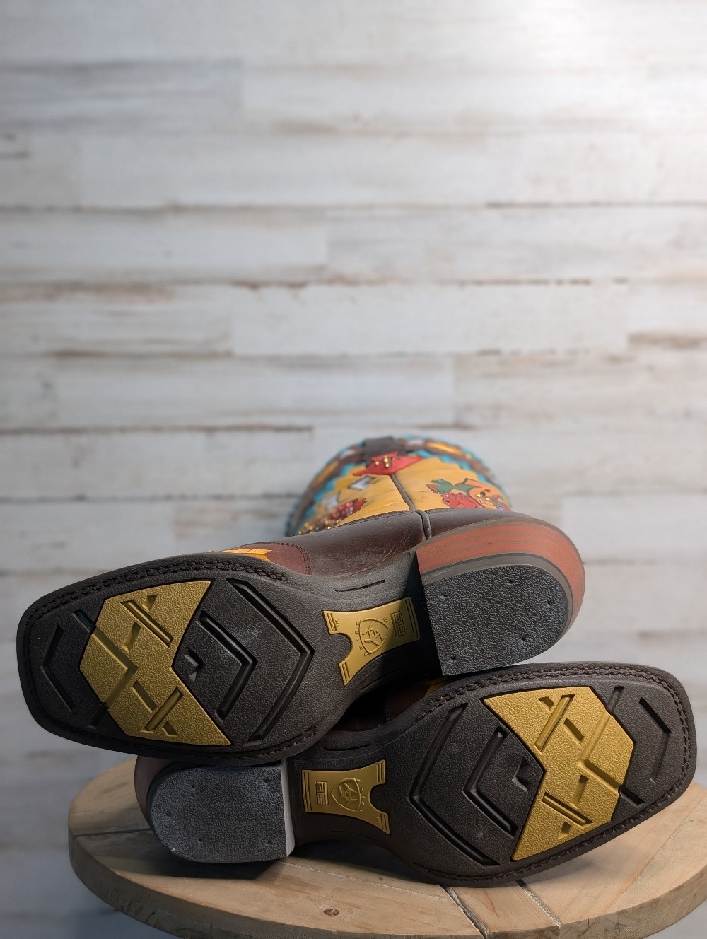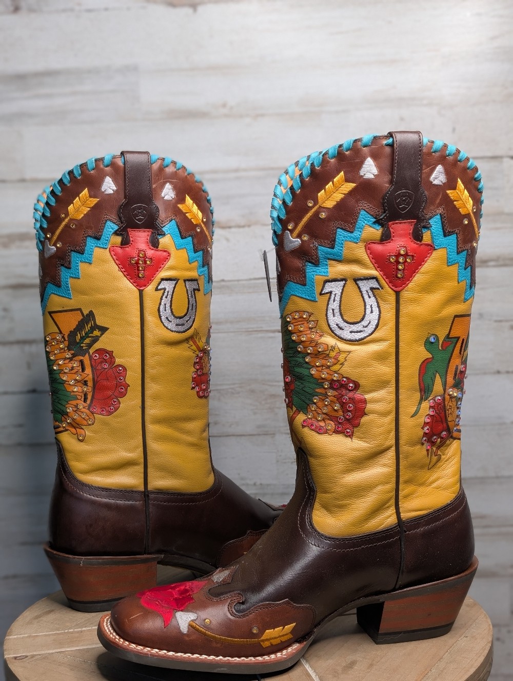 MESA BROWN WITH INDIAN HEAD AND ROSES. WIDE SQUARE TOE, 13" SHAFT HEIGHT. SIZE 9 B MEDIUM WIDTH STOCK 1008768
